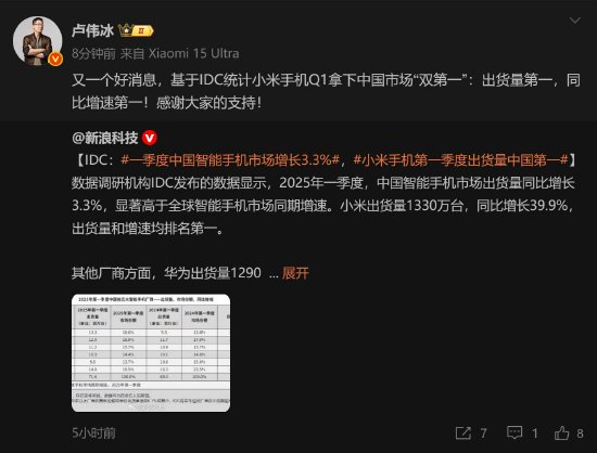 小米盧偉冰:小米手機Q1拿下中國市場“