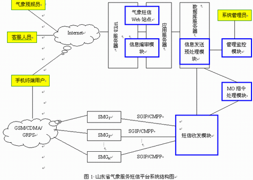 山東省氣象臺為實現“1210手機氣象站”服務,通過技術合作的方式建設了山東省氣象服務短信平臺。該平臺采用操作系統無關、開放性好的J2EE軟件架構,數據庫選用處理能力強、穩定性好的Oracle9i大型數據庫系統,該平臺目前正在為全省50萬用戶每天通過短消息提供各種天氣預報服務。下面將主要介紹氣象短信平臺的系統結構、各模塊功能和系統特點。