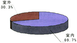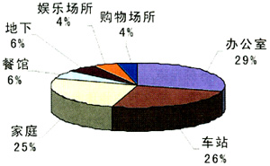 與目前2G網(wǎng)絡(luò)主要業(yè)務(wù)量來自于室外的情況不同,3G網(wǎng)絡(luò)的主要業(yè)務(wù)量來自于室內(nèi)。根據(jù)香港SUNDAY對業(yè)務(wù)數(shù)據(jù)的采集結(jié)果可知,3G業(yè)務(wù)的室內(nèi)發(fā)話量占總發(fā)話量的一半以上。而NTT DoCoMo的3G商用網(wǎng)絡(luò)用戶分布統(tǒng)計(jì)數(shù)據(jù)顯示,大約70%的業(yè)務(wù)量來自于室內(nèi)。3G商用網(wǎng)絡(luò)的用戶分布統(tǒng)計(jì)分析見圖1,而其室內(nèi)話務(wù)量明細(xì)見圖2。