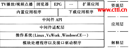 IPTV機頂盒作為客戶端產品,除了具有良好的硬件平臺外還需要軟件系統的配合才能夠實現IPTV業務功能。機頂盒的軟件大多采用分層結構,一般分成三層:應用層、中間解釋層和資源層,每一層都包括諸多程序和編程接口,如圖2所示。