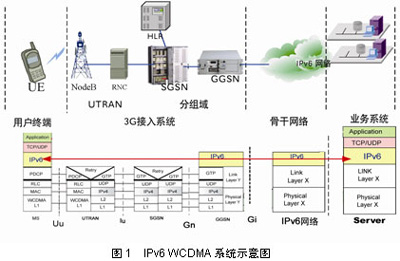 圖1所示為IPv6 WCDMA系統(tǒng)示意圖以及各節(jié)點(diǎn)的協(xié)議棧結(jié)構(gòu)描述。由圖中可見,UE訪問3G網(wǎng)絡(luò)外部服務(wù)器上的IPv6應(yīng)用,3G接入側(cè)除用戶終端與GGSN節(jié)點(diǎn)外,其他設(shè)備與IPv6協(xié)議棧無關(guān)。用戶端的IPv6數(shù)據(jù)經(jīng)過PDCP封裝到達(dá)RNC,在RNC上轉(zhuǎn)為GTP(GPRS Tunneling Protocol)封裝,通過RNC GGSN之間的GTP隧道傳送到GGSN設(shè)備上。這部分?jǐn)?shù)據(jù)傳送功能即3G系統(tǒng)為IPv6數(shù)據(jù)應(yīng)用提供數(shù)據(jù)鏈路層通道接入骨干網(wǎng)絡(luò)。