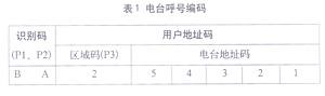 900 MHz無中心系統的電臺呼號編碼,由兩個英文字母和緊接字母的六位數字組成,如BA-2-54321。前兩位字母為識別碼,如遼寧省的識別碼為BA;第三位數字表示區域,稱為區域碼,其范圍為0~F,可分為16個區域,由省級無線電管理機構自行規劃和分配,如大連市的區域碼是2。第四位至第八位的5位數字表示電臺地址碼,范圍為00000~99999,共十萬個。區域碼加上電臺地址碼統稱為用戶地址碼。識別碼加上用戶地址碼構成了用戶電臺呼號編碼(如表1所示)。