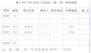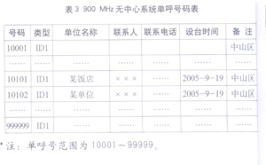 對900 MHz無中心系統的用戶電臺呼號進行管理,主要是對單呼號、組(群、網)呼號以及用戶單位信息的管理,這些工作可通過運用以下三張表格來完成:900 MHz無中心系統單呼號碼表,組(群、網)呼號碼表,用戶單位統計表(見表3、表4、表5)。例如,大連某飯店申請30個單呼號碼、1個組呼號碼,我們為其指配的單呼號碼范圍為10101~10130,組呼號碼為01001,并為組呼號碼設定專用信道Ch5。