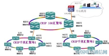 CESP節點設備在環中配置成Master節點和Slave節點。本項目中,可根據實際情況將822、832或842局中的任何一個節點的M8416配置成Master節點,通過M8416的10GE口上連IP骨干網。各區/縣的數據業務通過FE口匯聚到各節點的M8012設備上。