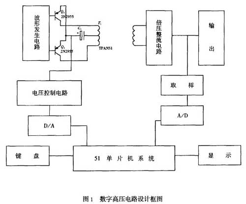 目前產生高壓電源的方法大致分為兩種:一種是模擬方法,另一種是數字方法。前者的穩壓電路、調節電路和顯示電路均采用模擬電路控制,而后者則是通過數字電路進行自動控制。傳統的高壓電源一般通過調整十圈電位器和波段開關預置所需電壓,電壓值由電壓表頭指示,這種手工控制和指示方式有很多缺點:調整麻煩,不能很快獲得所需電壓,指針讀數不精確,也不能在大負載和其他異常情況下自動監測和自身保護。另外,實驗室中的儀器或設備,有些同學難免會亂動旋鈕和開關,造成下次開機時因電壓過高而損壞儀器。本文所介紹的數字系統采用鍵盤輸入、程序控制、數碼顯示,可以很好的解決以上問題。