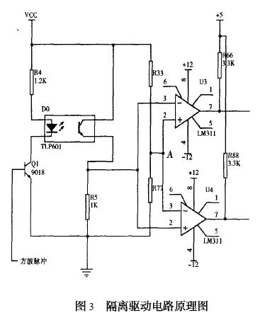 電路采用電壓比較器作為驅動電路,它能產生一組幅度相等、相位相反的脈沖信號,分別加到兩個開關管基極,很好的滿足電路的要求。這種方式具有電路簡單、驅動功率大、輸出波形好的特點,從而避免了采用體積較大而笨重且繞制繁瑣的變壓器驅動。隔離與驅動電路原理圖如圖3所示。