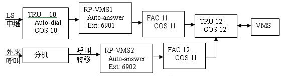 智能話務員:當呼叫由公網(wǎng)進入HARRIS交換機后,交換機自動將呼叫匯接至LINE型中繼上,利用模擬用戶的鈴流去啟動VMS系統(tǒng)(接口簡單),LINE中繼發(fā)送一串代碼給VMS系統(tǒng),通知VMS系統(tǒng)將接收端口轉換為智能話務員端口,并根據(jù)主叫的要求對電話進行處理。