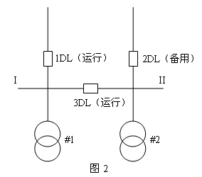 橋接線的主接線形式(如圖2),且一線帶兩變的,如果#1變差動保護動作,跳開1DL、3DL,兩條母線同時失電,備自投裝置應啟動,合上2DL,繼續對#2變供電。