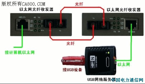 以上的方案為兩邊都是計算機,都能夠安裝驅動程序。如果上面的應用中僅有一邊為計算機,而另外一邊為USB設備呢?由于USB設備不能夠安裝驅動程序,就必須采用其它的USB光纖通信方案。在常用的幾種外部接口中,目前采用光纖傳輸技術比較成熟的是以太網。先通過光纖將以太網延長到遠端,然后將遠端的以太網轉換成為USB口,這樣就實現了USB的光纖遠程通信。而現在的計算機都有以太網口,即使沒有以太網口的情況下從USB口轉換出一個以太網口也是很方便的。