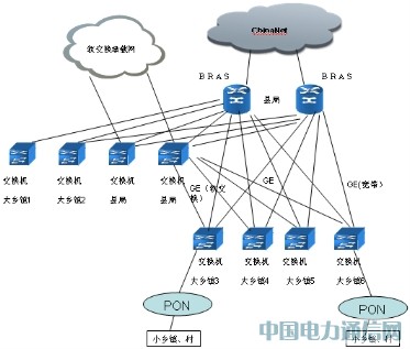 1)數據業務:通過CPE接入,經由大鄉鎮匯聚交換機匯聚,然后直接接入BRAS;