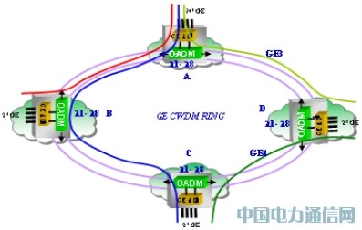 對于數據業務,面對“三網合一”需求帶來的巨大帶寬要求,對帶寬需求至少為GE,因此現在普遍采用CWDM進行接入層建設,采用DWDM進行匯聚層和匯聚層以上建設。