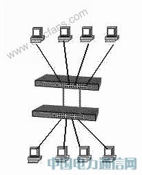 前面我們已接觸到端口聚合的特點(diǎn),此種方式相當(dāng)于用多個(gè)端口同時(shí)進(jìn)行級(jí)聯(lián),它提供了更高的互聯(lián)帶寬和線路冗余,使網(wǎng)絡(luò)具有一定的可靠性。其結(jié)構(gòu)示意圖如下所示。