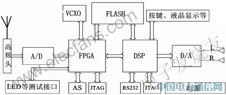 根據(jù)對(duì)DAB接收機(jī)組成部分的分析,本次設(shè)計(jì)采用FPGA+DSP的設(shè)計(jì)方案,DAB接收機(jī)完整的結(jié)構(gòu)框圖如圖2所示。DAB信號(hào)從天線(xiàn)接收后進(jìn)入高頻頭部分,選出所需的頻率塊,然后將選出的高頻信號(hào)送入混頻器,變?yōu)橹行念l率為38.912MHz、帶寬為1.536 MHz的中頻信號(hào),中頻信號(hào)濾掉無(wú)用的頻譜部分后再經(jīng)頻率變換和濾波,變?yōu)橹行念l率為2.048 MHz、帶寬為1.536MHz的基帶信號(hào)。然后進(jìn)入ADC,采樣速率為8.192MHz,轉(zhuǎn)換成數(shù)字信號(hào)后進(jìn)入FPGA。FPGA完成并串轉(zhuǎn)換,同步和解調(diào), 以及VCXO所需的控制電路等。處理后的數(shù)據(jù)進(jìn)入DSP,DSP外部時(shí)鐘為24.5MHz,所以DSP可進(jìn)行4倍頻,工作于100MHz。DSP中完成解交織、Viterbi譯碼、解擾以及音頻解碼,最后數(shù)據(jù)被送入DAC,恢復(fù)出原始模擬信號(hào),送入喇叭即可收聽(tīng)。