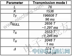 歐洲D(zhuǎn)AB系統(tǒng)規(guī)定了4種模式,本設(shè)計(jì)采用的是第1種模式,具體參數(shù)如表1所示。其中,L表示一幀的符號(hào)數(shù),K表示每個(gè)符號(hào)的子載波個(gè)數(shù),TF表示一幀的持續(xù)時(shí)間,TNULL表示空符號(hào)持續(xù)時(shí)間,Ts表示每個(gè)符號(hào)的持續(xù)時(shí)間,Tu表示有效符號(hào)的持續(xù)時(shí)間,Δ表示保護(hù)間隔的持續(xù)時(shí)間。