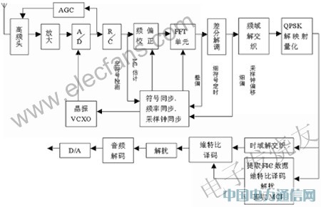 DAB接收機(jī)原理框圖如圖1所示。DAB接收機(jī)將從天線(xiàn)接收到的信號(hào)經(jīng)過(guò)高頻頭轉(zhuǎn)為中頻模擬信號(hào),放大后進(jìn)行A/D變換,得到數(shù)字信號(hào)。其中A/D采樣時(shí)鐘受晶振VCXO的控制,采樣時(shí)鐘偏移由采樣時(shí)鐘同步部分估計(jì)得到。A/D轉(zhuǎn)換后的數(shù)據(jù)一路做AGC檢測(cè)去控制高頻頭的輸出,另一路經(jīng)過(guò)R/C變換成FFT所需要的兩路實(shí)虛部數(shù)據(jù)信號(hào)。時(shí)間同步部分估計(jì)得到一個(gè)時(shí)域符號(hào)的同步頭,并粗略地估計(jì)由于收發(fā)頻率不一致而引起的頻偏。經(jīng)過(guò)FFT變換后,頻率同步單元定出FFT的窗口位置,校正帶有頻偏的數(shù)據(jù)。校正后的數(shù)據(jù)經(jīng)過(guò)信道估計(jì),得到當(dāng)前實(shí)時(shí)的信道響應(yīng),經(jīng)過(guò)信道均衡處理以消除信道多徑衰落的影響,然后再經(jīng)過(guò)解映射軟判決譯碼和解擾,然后將音頻信號(hào)送入信道解碼器解碼,接著進(jìn)行信源解碼和音頻綜合,最后經(jīng)D/A還原成模擬音頻?