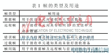CAN系統(tǒng)中節(jié)點(diǎn)之間以報(bào)文的形式進(jìn)行通信,其報(bào)文有五種類型:數(shù)據(jù)幀、遠(yuǎn)程幀、錯(cuò)誤幀、過(guò)載幀和幀空間[2]。每種幀都有相應(yīng)固定的格式,其中數(shù)據(jù)幀和遠(yuǎn)程幀與應(yīng)用密切相關(guān),其他類型幀由CAN控制器根據(jù)具體的情況自動(dòng)傳輸。幀種類及用途如表1所示。