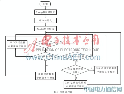 本設(shè)計(jì)程序主要包括:串口初始化程序、SJA1000初始化程序、單片機(jī)接收串口中斷服務(wù)子程序、單片機(jī)發(fā)送數(shù)據(jù)到串口中斷服務(wù)子程序、單片機(jī)接收CAN數(shù)據(jù)子程序、單片機(jī)發(fā)送CAN數(shù)據(jù)程序以及一些異常錯(cuò)誤處理子程序等等。程序流程圖如圖3所示。