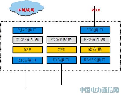 IAD 通過 FXO 模擬中繼與 PSTN 電話網連接,提供本地電話業務;通過 IP 網與運營商 VoIP 網聯結,實現 IP 長途。
