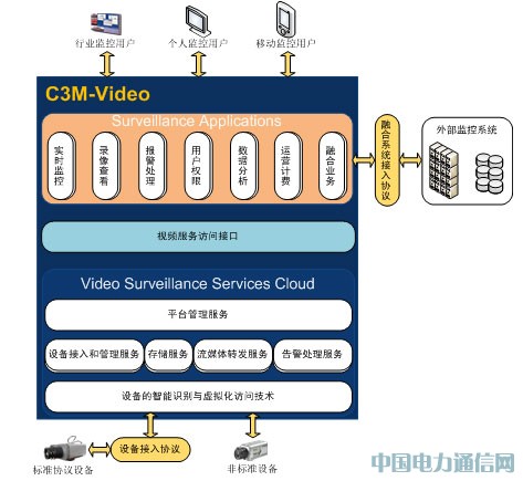 高新興通信最新推出基于云計算的C3M-Video視頻監(jiān)控管理平臺,具有視頻監(jiān)控管理平臺的通用功能和業(yè)務(wù)流程,能支持國內(nèi)外主流的視頻設(shè)備。此外,能與高新興現(xiàn)有的動力環(huán)境監(jiān)控系統(tǒng)進(jìn)行深度的融合,并以此為基礎(chǔ)逐步演繹成一個支撐物聯(lián)網(wǎng)應(yīng)用的融合監(jiān)控平臺。