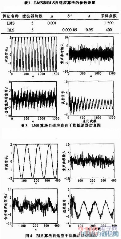本研究中分別應用LMS算法和RLS算法進行自適應直達干擾抵消處理,并給出計算機仿真結果。算法的參數設置如表1所示。抵消濾波結果見圖3、圖4所示。