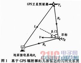 基于GPS輻射源的無源雷達的幾何關系如圖1所示。