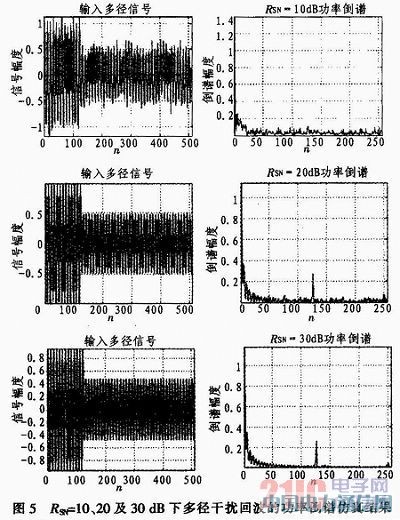 通過計算機仿真可得,信噪比分別為RSN=10、20及30dB情況下,功率倒譜仿真曲線如圖5所示?梢姡灰猂SN足夠大(≥20dB)的情況下,可以有效地進行多徑干擾信號的分解。通過功率倒譜反運算(求fft、冪運算和ifft等),可獲得多徑干擾抑制后的回波信號。