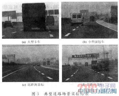 圖3為典型道路場景下的實驗結果,圖3(a)為大型卡車;(b)為小型面包車;(c)為遠距離處;(d)為近距離處的檢測結果。系統將檢測到的目標用黑框標記出來。