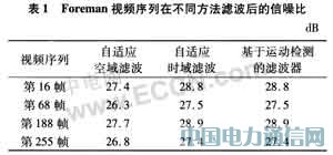 經過分析可以發現,使用空域濾波器得到的效果最差,時域濾波器得到的效果比較好,但是在圖像運動部分效果一般。用本文提出的基于運動檢測的算法處理時,得到的效果最好,其信噪比有很大的提高,同時,主觀上可以看出明顯的區別。