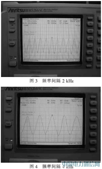 筆者采用TI的320VC系列浮點DSP實現了低中頻上進行線性調頻的數字化信號產生,通過權衡RAM容量大小與硬件成本,信號設計為400ms往復循環,以節省硬件成本。圖3、4為該方案最終實現不同間隔、不同頻點數的多頻點攔阻式于擾信號結果。