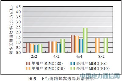 圖5給出了下行鏈路平均頻譜效率。假定eNodeB處使用的是均勻線性陣列,與采用2×2天線配置的R8相比,采用4×2天線配置的R10 MU-MIMO能夠將容量提高40%。與R8相比,采用4×4天線配置的MU-MIMO能夠將容量提高100%。使用4根發射天線的交叉極化陣列,增益數值略有減小。MU-MIMO對蜂窩邊緣數據速率的好處甚至要高于對平均數據速率的好處,如圖6所示:與采用2×2天線配置的R8相比,4×4天線配置能夠將蜂窩邊緣數據速率提高150%。但是,需要注意的是,蜂窩邊緣吞吐量、峰值吞吐量和平均吞吐量數值可能會相互折衷,這取決于調度和多用戶配對策略。已經證實,通過在第二空間層采用比例公平頻域調度,選擇保持公平性會導致覆蓋性能顯著提高。另一方面,選擇針對第二個用戶的頻域調度的最大C/I類型將會提升峰值吞吐量,從而以犧牲覆蓋范圍為代價,提高了平均吞吐量增益。