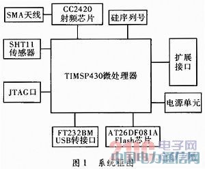 無線傳感器網絡由大量無線傳感器節點組成,每個節點由傳感器采集數據,數據處理芯片負責接收和處理傳感器采集到的數據,通過無線射頻芯片進行數據的無線傳輸與接收以及無線組網功能。USB接口可以作為電源以及編程接口,一線硅序列號可作為節點的唯一標識,Flash芯片用于存儲數據,JTAG口用于調試與編程。