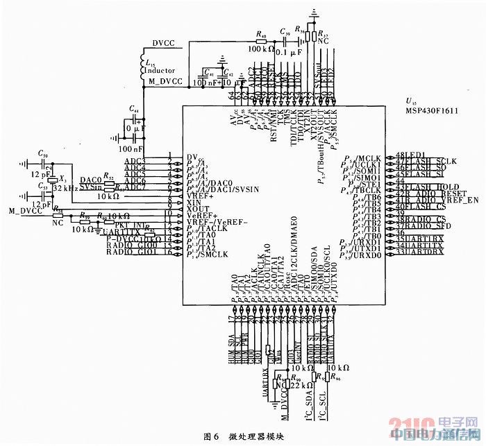 微處理器是無線傳感器節點的核心,傳感器數據的數據處理,串行口以及無線模塊的傳輸與控制均需要微處理器的參與。節點微處理器TI公司的16為超低功耗MSP430F1611。該微處理器工作電壓為1.8~3.6V,在RAM數據保持方式下耗電僅為0.2μA,在激活工作1MHz的情況下為330μA,可以工作在5中低功耗模式,喚醒時間<6μm。Flash大小為48kB,RAM大小為10kB。芯片內部有16位定時器Timer_A和Timer_B具有捕獲/比較功能;大量的捕獲/比較寄存器可用于事件計數、時序發生等;多功能串口(USART)可以實現異步、同步和I2C串行通信,可以方便地實現多級通信的應用;具有較多的I/O端口,最多達6×8條I/O口線,P1、P2口還可以接收外部上升或下降沿的中斷輸入;12位A/D轉換器有較高的轉換速率,最高可達200kbit·s-1,能滿足大多數數據采集的應用。微處理器模塊如圖6所示。溫度濕度傳感器連接P1口5、6、7管腳,無線模塊SPI接在P3口1、2、3和P4.4管腳,USB通信模塊數據線連接到P3口6、7管腳。其他管腳分別用于控制和擴展接口。外部晶振大小為32MHz。