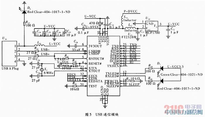 無線傳感器網絡由大量節點組成,這些節點按一定協議將采集的數據進行融合、傳輸,最終將數據傳送到個人電腦上進行處理和觀察,同時節點工作需要將特定的程序寫入Flash中。目前個人電腦最常用的接口為USB,而微處理器使用USART接口,為實現兩種接口之間轉換,節點使用FT232BM芯片作為轉換芯片。FT232BM是一種單片USB到異步串口轉換芯片,支持全握手和調制解調接口信號,在TTL級數據傳輸速度范圍為300bit·s-1~3Mbit·s-1。芯片通過USB總線供電,工作電壓為4.35~5.25V,采用外部6MHz時鐘。USB PID、序列號和產品信息可以保存在外部EEPROM中。USB通信模塊接口如圖5所示。
