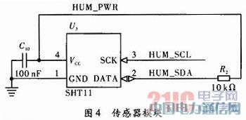 傳感器是無線傳感器節點的數據采集單元,可以根據實際需要選用不同的傳感器,節點采用溫度、濕度傳感器SHT11。SHT11是一款將溫度、濕度傳感器、信號放大調理器、A/D轉換器和總線接口集成于一個芯片上的單片全校準數據輸出傳感器,它可以直接提供溫度在-40~120℃范圍內且分辨率為14 bit的數字輸出和濕度在0~100%RH范圍內且分辨率為12bit的數字輸出。傳感器及外圍模塊如圖4所示。