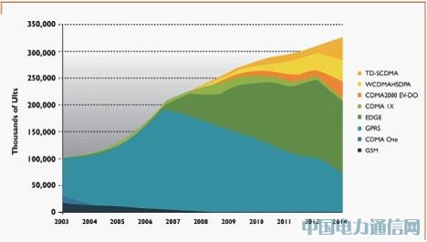 2009年1月,中國政府發放3G牌照。中國移動?接管TD-SCDMA網絡,中國聯通?和中國電信?分別接管WCDMA和CDMA網絡。根據他們2010年發布的年度報告,中國移動已經部署了19.9萬多個基站,到2011年中期將覆蓋656個城市。據稱,中國3G用戶市場呈現井噴態勢。而根據iSuppli2的市場分析,中國移動將在中國3G用戶市場占據最大份額。圖2是iSuppli?按照接入技術對2010-2014年的手機市場所做的預測。自從TD商用之后,中國移動便通過投資產業鏈推動TD市場。到2010年末,中國移動已經擁有2000萬用戶,截止2011年11月底,TD用戶已突破4800萬,2011年,TD用戶有望凈增3000萬。