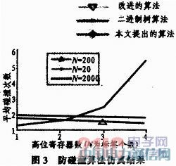 算法仿真:仿真結果如圖3所示,可以看到當標簽總數為20時,如果把高位寄存囂的位數從4降到1,則平均碰撞次數從5.5回落到1.4。而當標簽總數為200和2000時,高位寄存器位數的改變對平均碰撞次數的影響不大。因此如果在某次仲裁中出現多次空傳,讀寫器可以在下一次仲裁時指示標簽改變寄存器高位個數,以此降低空傳率,進而可以降低平均碰撞次數。