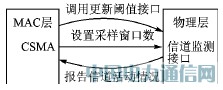 從接口上看,物理層的信道監(jiān)測(cè)只是提供給MAC層的CSMA協(xié)議一個(gè)探測(cè)信道的接口。為了設(shè)計(jì)一個(gè)靈活的信道探測(cè)接口給上層,就必須給上層一些調(diào)整的接口,例如可以讓上層來(lái)設(shè)定具體某次監(jiān)測(cè)的采樣次數(shù),這樣上層就可以根據(jù)不同的實(shí)際情況來(lái)設(shè)定采樣數(shù)。圖2為物理層信道監(jiān)測(cè)提供的接口與MAC層CSMA的關(guān)系簡(jiǎn)圖。