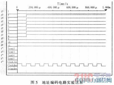 地址編碼電路實驗波形如圖5所示,圖中9、10、11分別表示圖2中SA0、SA1、/IOR,圖中1~7代表圖2中芯片U2或U3的15~7引腳。從實驗結果可以看出當SA0、SA1、/IOR都為低電平“0”時,/IOR0為低電平“0”,/IOR0有效選中相應的模塊,實現地址編碼功能。