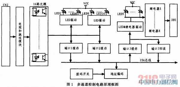 按照工作原理可將多通道控制電路分為地址編碼電路、繼電器控制輸出通道電路和光耦隔離輸入通道電路3部分。