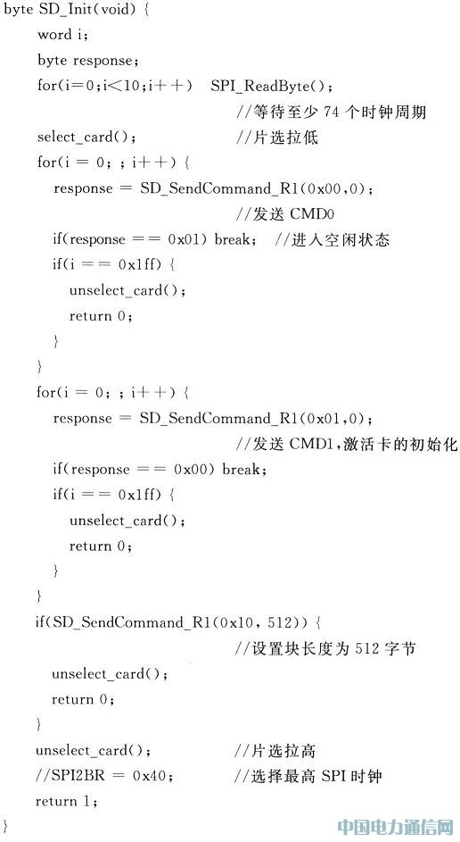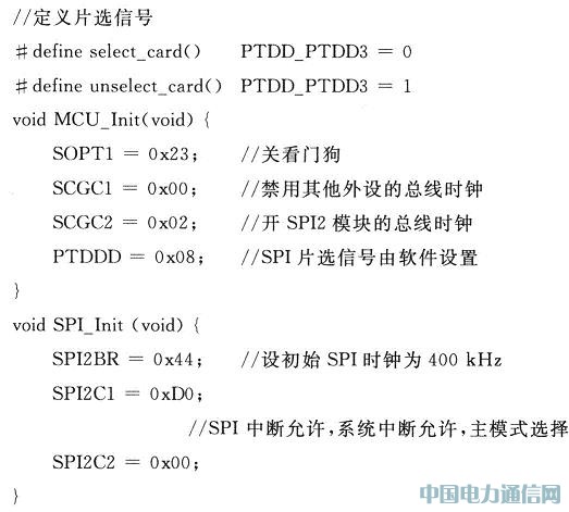 在與SD卡通信之前,首先需要配置MCF51QE128,并初始化SPI端口。代碼如下: