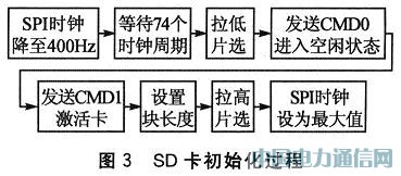 SD卡的初始化要遵循一定的步驟。首先將SPI時鐘降低到400 kHz,等待至少74個時鐘周期。接著拉低片選信號,并發送CMD0命令,對SD卡進行復位并使其進入SPI模式,這里需要正確的CRC校驗,校驗字節為 0x95。若SD卡進入空閑狀態(即接收響應為0x01時),則發送CMD1命令,激活卡的初始化過程,此時響應為0x00。然后設置塊的長度,一般為 512字節。最后將片選拉高并將SPI時鐘設為最大值,以保證最大的讀寫速度。SD卡初始化過程如圖3所示。