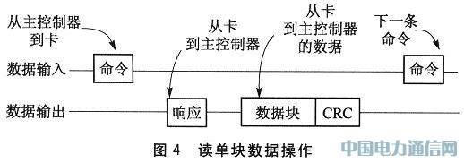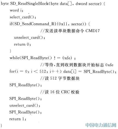 SPI模式支持單塊和多塊數據的讀寫操作,可通過發送相應的命令來實現。讀單塊數據的操作過程如圖4所示。拉低片選后,首先由主控制器 MCF51QE128發送讀單塊數據命令CMD17,然后等待SD卡的響應。當收到數據塊開始標志0xfe后,開始從SD卡讀取512字節的數據,最后讀取2字節的CRC校驗位。