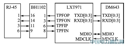 本系統用LXT971作為快速以太網物理層自適應收發器。LXT971支持IEEE 802.3標準,提供MII(MediaIndependent Interface)接口,可以支持MAC;而DM643內部正好集成有MAC控制器,所以LXT971可與DM643實現無縫連接。連接電路如圖3所示,其中BH1102為1:1的隔離變壓器。