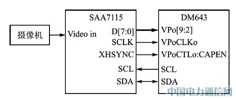 本系統采用的視頻解碼芯片是Philips公司的SAA7l15.從攝像機輸入的全電視信號在SAA7l15內部經過鉗位、抗混疊濾波、A/D轉換、YuV分離電路之后,在YuV到YCrCb的轉換電路中轉換成BT.656視頻數據流,通過DM643的視頻口VPo輸入到壓縮核心單元DM643中。視頻數據的行/場同步信號包含在BT.656數字視頻數據流的EAV(End of Active Video)和SAV(Startof Active Video)時基信號中,視頻口只需視頻采樣時鐘和采樣使能信號。SAA7l15內部寄存器參數的配置和狀態的讀出通過1 C總線進行。視頻采集接口的原理如圖2所示。
