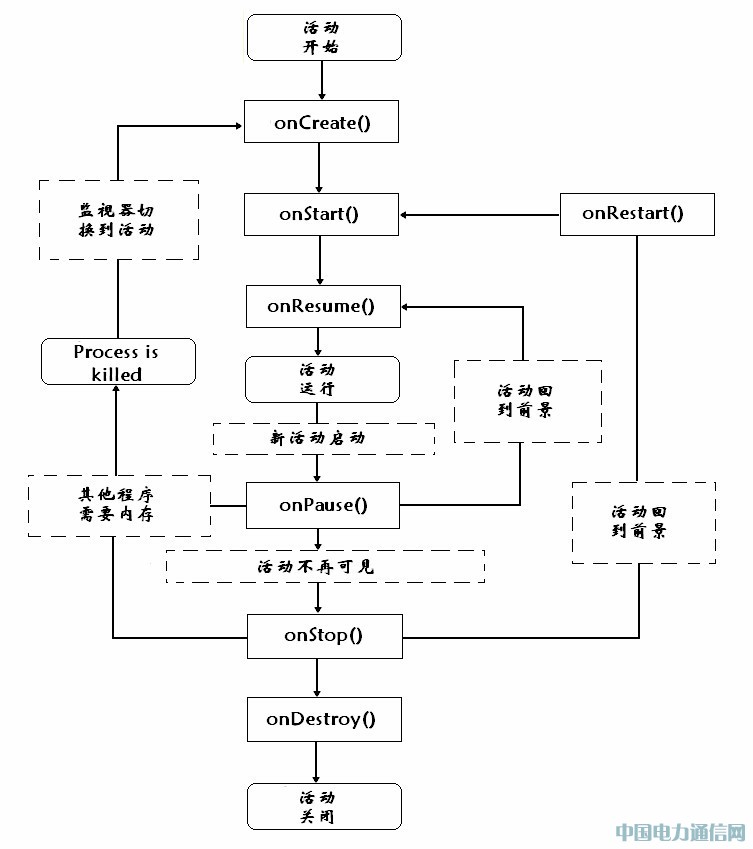 onCreate()方法在活動開始時調用,并依次調用onStart()方法和onResume()方法,Activity 處于運行狀態,如有新活動啟動,則調用onPause(),活動轉入后臺;如內存不足,活動進程則被關閉。退出程序則會依次調用onStop()和onDestroy()。