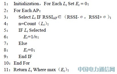 對每個掃描到的AP 的RSSI 值,設定一個選擇區間[RSSI-σ,RSSI+σ],σ為多次實驗的經驗值,在指紋庫中查找滿足此區間范圍的位置點,若有n 個位置點落在此區間范圍,則這些位置點分別取權值為1/n,其他的位置點則取權值為0;對所有AP 做如上處理后,選出權值最大的位置點為估計位置。如有多個位置點權值一樣,則比較信號強度距離,取最小者。