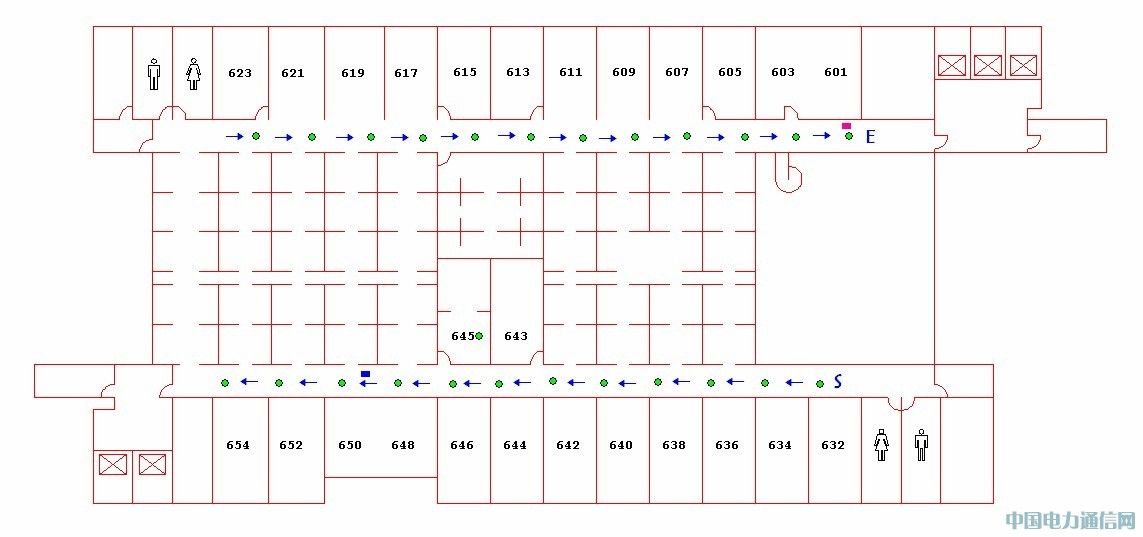 實驗在計算所6 層進行,見圖12,在南北兩側走廊總共采集了24 個位置點,距離約4米,加上在645 房間,總共25 個位置點的數據。掃描周期1s,掃描次數120 次。采集數據耗時約1 小時。