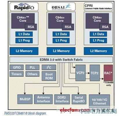 3.多內核DSP支持端對端性能。TCI6487與TCI6488借助其豐富的高性能特性支持處理密集型高密度應用的需求。多內核DSP具備片上加速器,因此無需FPGA或微處理器就能支持多種無線通信應用。這兩種DSP都采用符合OBSAI與CPRI標準的片上天線接口,支持通過背板直接連接至RF收發器卡或遠程無線頭端(RRH)。