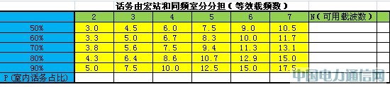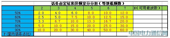 表一:單宏扇區話務容量(等效載頻數)與載頻數和室內話務占比的數值分析結果