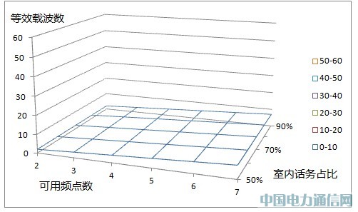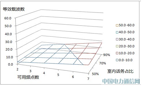 該曲線族可以看出,由于全面采用宏小區覆蓋,作為容量特征的等效載波數,與室內話務占比無關,與可用頻點數呈線性增長關系,該結果可作為同/異構網絡的容量基線。
